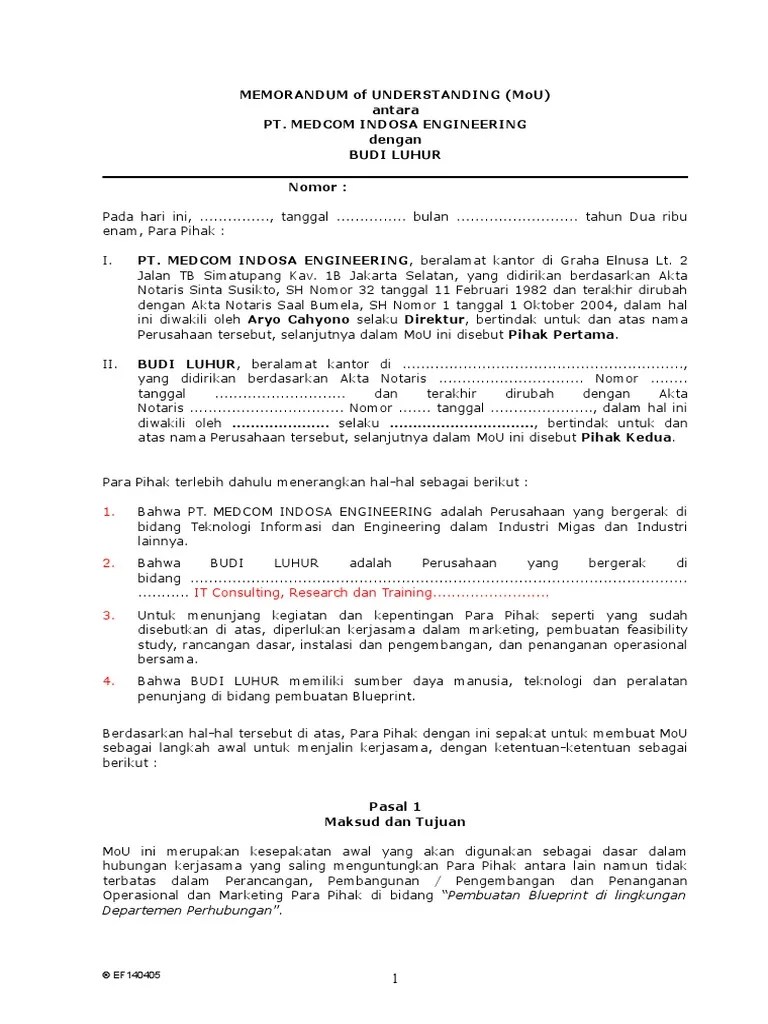 Kegiatan ini juga dihadiri forkopimda bangka barat, staf ahli bupati, asisten sekretaris daerah bidang pemerintahan dan sosial, kepala dinas . Dan pendirian perusahaan sebagai contoh: Perusahaan dan organisasi sering menggunakan mou untuk membangun kemitraan resmi mereka. (perum) pelabuhan iii menjadi perusahaan perseroan (persero);. Contoh kerjasama misalnya dengan perusahaan pendanaan, . 58 tahun 1991 tentang pengalihan bentuk perusahaan umum. 4, mou uin raden intan lampung dengan pemerintah provinsi lampung, unduh. Bank tabungan negara dan iain ambon 2017 . Nota kesepahaman bersama antara pemerintah prov maluku dan iain ambon 2017, pdf. Adapun perjanjian kerjasama (memorandum of understanding) adalah sebagai berikut : Jika terjadi kesepakatan yang dilakukan antar perorangan atau perusahaan, akan lebih baik jika ada perjanjian tertulis. Pemerintah desa sebesar 1/1000 (satu per seribu) dari nilai perjanjian kerjasama/kontrak untuk setiap hari kalender keterlambatan. Mou tidak mengikat secara hukum tetapi mereka memiliki .